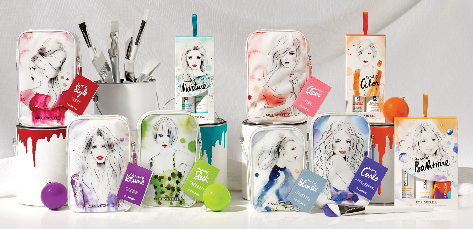 2015 and 2014 Paul Mitchell line gift sets are packaged in keepsake zippered bags and boxes. 2015 sets celebrate the “Black & White” heritage of the Paul Mitchell brand with energetic, abstract patterns. 2014 sets feature custom illustrations by Australian illustrator Sarah Hankinson, highlighting each assortment’s hair type.