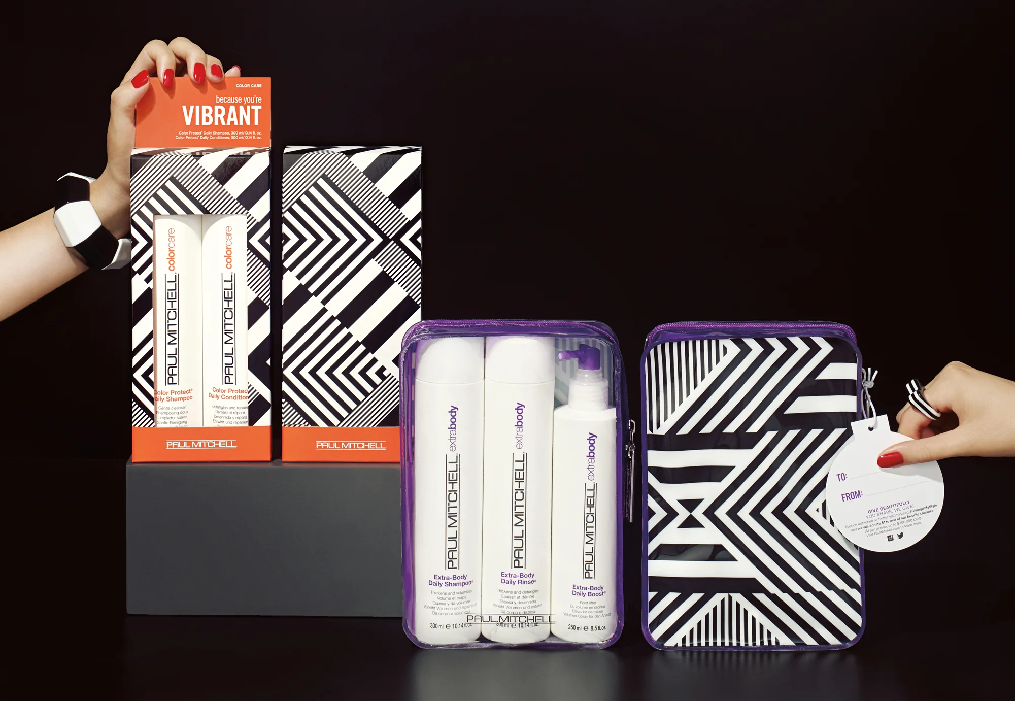 Paul Mitchell offers gift sets and limited editions for all of its brands each holiday season. As these are a major source of revenue for salons and retailers, unique structures and striking designs are a must.